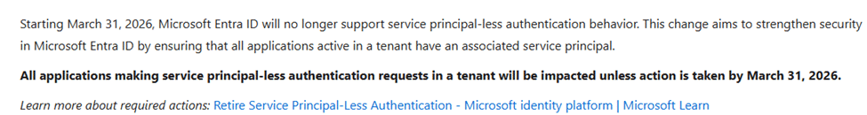 Microsoft is retiring service principal-less authentication, but they are mentioning that enforcement is targeted at third-party applications.