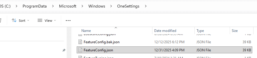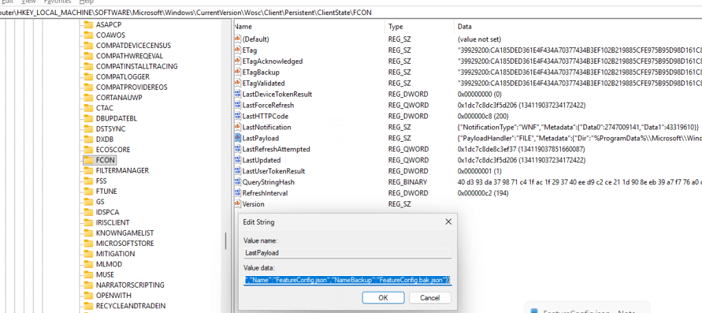 FeatureConfig.json is one of the important one here. It contains the feature identifiers, rollout state, device targeting attributes, flight identifiers, staged rollout metadata, and whether a feature should be enabled, disabled, or delayed on that specific system. Inside that payload is a JSON document containing feature identifiers, rollout state, targeting metadata, wave information, device attributes, and other evaluation rules.