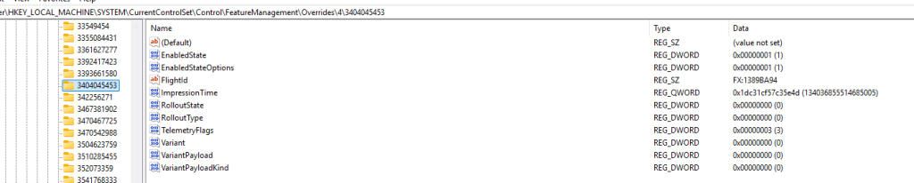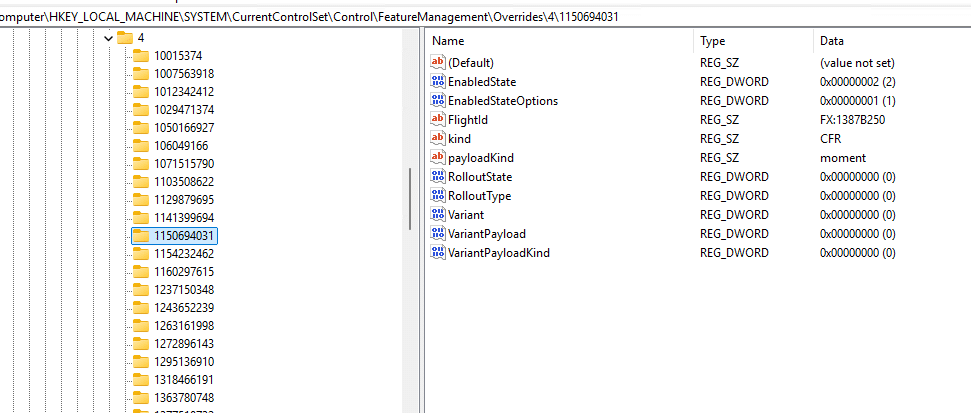 Some Feature IDs (like 45172197) inside this file may look familiar. For example, the ShadowAdmin feature appears as one of the FIDs inside the payload. And that same data is mirrored into the registry under: HKLM\SYSTEM\CurrentControlSet\Control\FeatureManagement