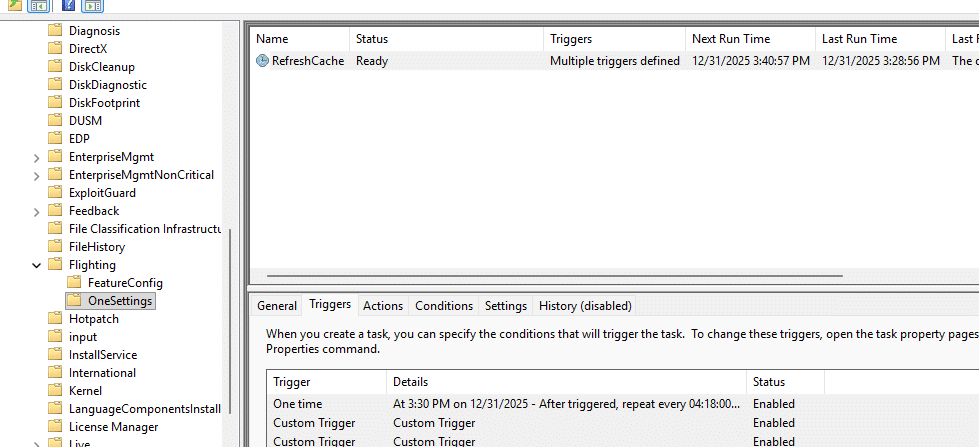A device can update its Feature Configuration through scheduled refresh or through event-driven triggers. Both end up feeding the same evaluation logic, but they are initiated for different reasons. Scheduled refresh happens through the OneSettings RefreshCache task.