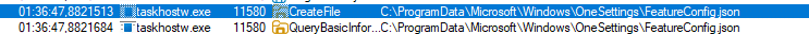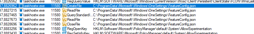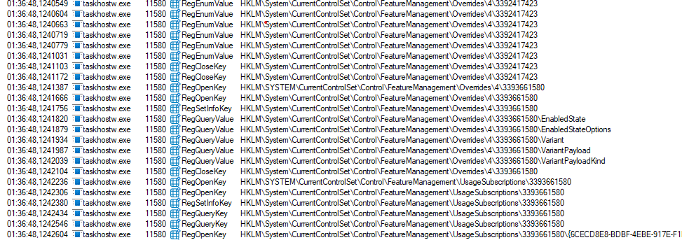 During this same pass the code also reads flight and usage metadata. Procmon traces clearly show lookups of flight IDs, reporting targets, rollout timestamps, and feature impression state. This information is used both for gating and for telemetry reporting. Only after this reconciliation pass does the device decide whether a given feature flag should be enabled or remain off.