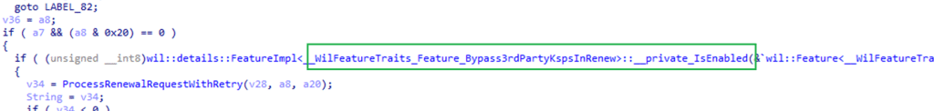 When Microsoft delivers a new feature or a servicing fix, the code is often shipped broadly as part of a cumulative or feature update but remains disabled by default. The logic sits behind a feature gate, such as the check that guarded the KSP renewal behavior. (ProcessRenewalRequestWithRetry is gated by the Feature_Bypass3rdpartyKspInrenew check.)
