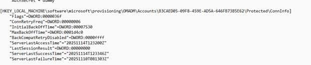 Inside that key sits a packed structure the client calls AcctInfo (AccountInfo). That block contains the server URL, retry timers, flags and, more interesting for this story, the timestamps Intune uses for last check in: