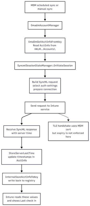 So from the device’s perspective, a session with Intune can begin even if the certificate is completely out of date. This raised a new question: how does the device even reach Intune without a valid certificate?
