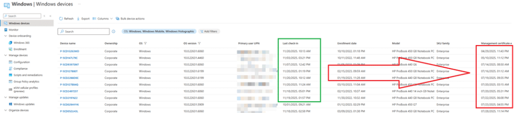 If you truly want to know if a device is still under management, you have to look beyond that single value. Start with the Management certificate expiration date itself and from there on sort by last check-in. That is where the truth sits.