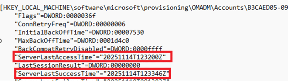 Not just in the Intune portal. The registry under the OMADM account key showed the same thing.