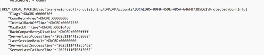 Inside that key sits a packed structure the client calls AcctInfo (AccountInfo). That block contains the server URL, retry timers, flags, and, more interesting for this story, the timestamps Intune uses for the last check in: