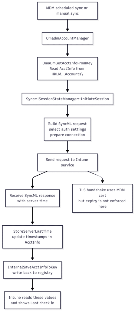 When the device talks to Intune, the OMADM client does not just fire off a web request. It first loads this AcctInfo structure, runs a session setup, and only then starts sending SyncML. You can picture the simple version of the flow like this: