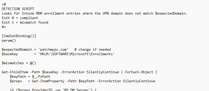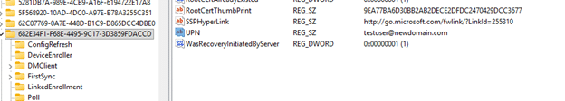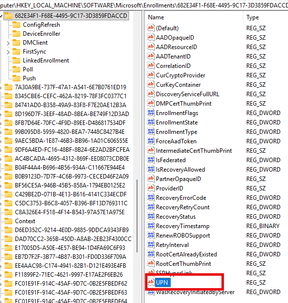 The registry keys containing information about the Intune enrollment held the first clue: HKLM\SOFTWARE\Microsoft\Enrollments\{EnrollmentID}