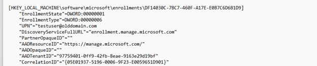 All the affected devices shared a common characteristic. They belonged to users who had recently been migrated to a new domain name after a merger. Their email domains and UPNs were changed, and the old domain was later removed from the authorized domains, but the enrollment data stored on the device remained unchanged. Checking one of the devices confirmed it: