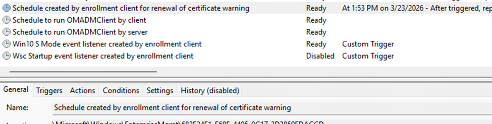 The renewal process described in the earlier blog still applies; however, the Intune MDM device certificate renewal logic has been updated. The Enrollment Service (Dmenrollengine.dll) now handles the certificate renewals in the background. It’s faster and less visible, but it depends entirely on what’s stored in the registry. A single outdated UPN can block renewal entirely.