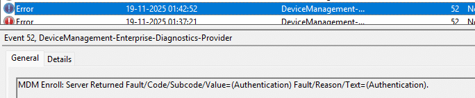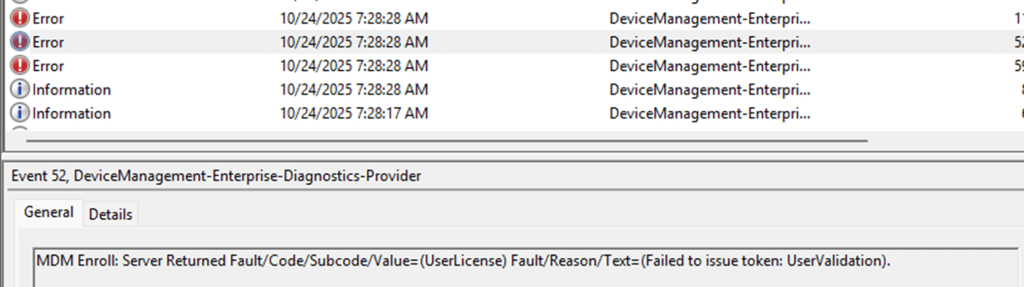 Event 52: MDM Enroll: Server Returned Fault/Code/Subcode/Value=(UserLicense)Â Fault/Reason/Text=(Failed to issue token: UserValidation)