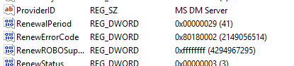 The devices were still checking in, receiving policies, and showing up as compliant, but the Intune MDM certificate stayed untouched. When reviewing the blog mentioned above, the first thing to check is the RenewErrorCode.