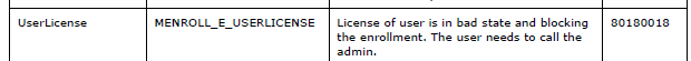 License of user is in bad state and blocking the enrollment. The user needs to call the admin.